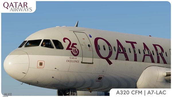 The Qatar A320ceo livery represents the aircraft A7-LAC, featuring a "25 Years of Excellence" sticker and equipped with CF...